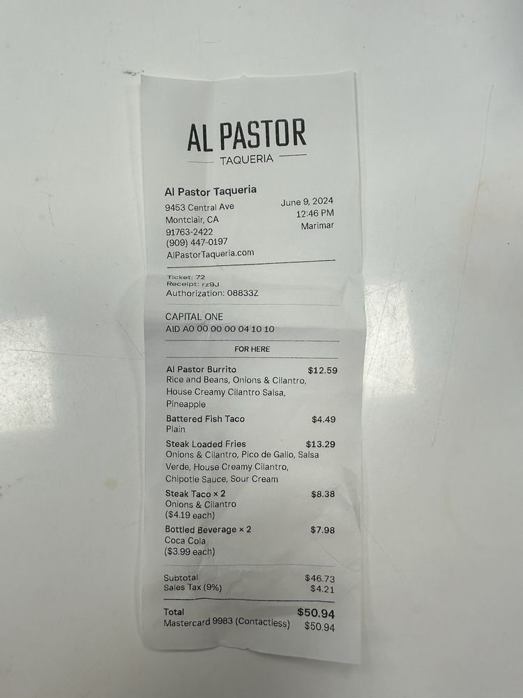 Welcome to Al Pastor Taqueria, a hidden gem nestled in Montclair, CA, that promises a delightful taco experience. The menu is a taco lover's dream, featuring handcrafted street tacos made with fresh ingredients, including the signature Al Pastor Taco and other tempting options like Battered Fish and Birria Tacos, each priced around $4.89 to $4.99.